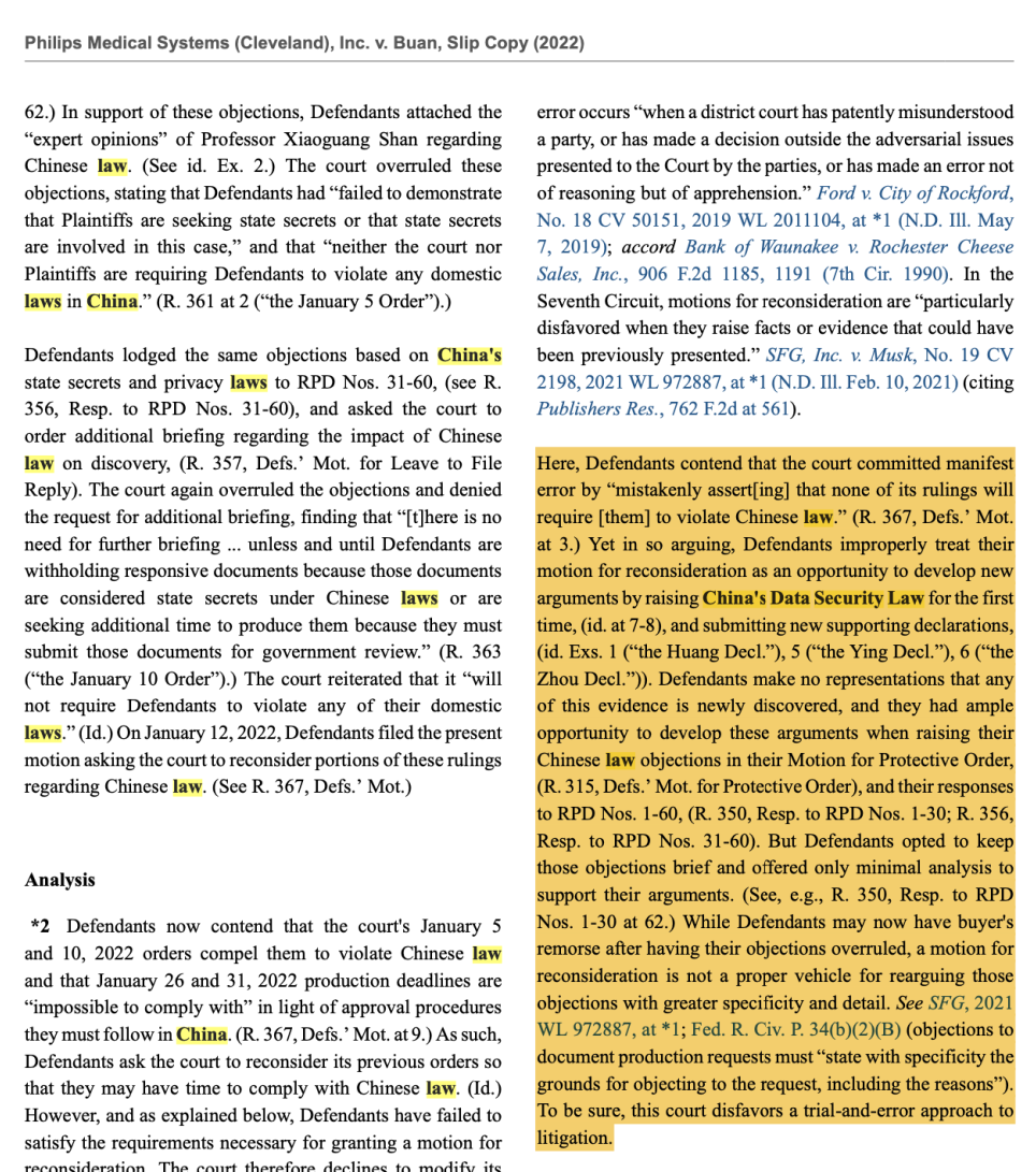 被告辩称,法院犯了明显的错误,“错误地断言,其任何裁决都不会要求他们违反中国法律”。然而,在这种争论中,被告不恰当地将他们的复议动议视为发展新论点的机会,首次提出中国《数据安全法》,并提交新的支持声明。被告没有提出任何证据是新发现的,他们在保护令动议中提出中国法律反对意见时,他们有充分的机会提出这些论点,虽然被告在异议被推翻后,现在可能会有后悔,但重新考虑动议并不是以更具体和更详细地重新提出这些异议的适当方法。