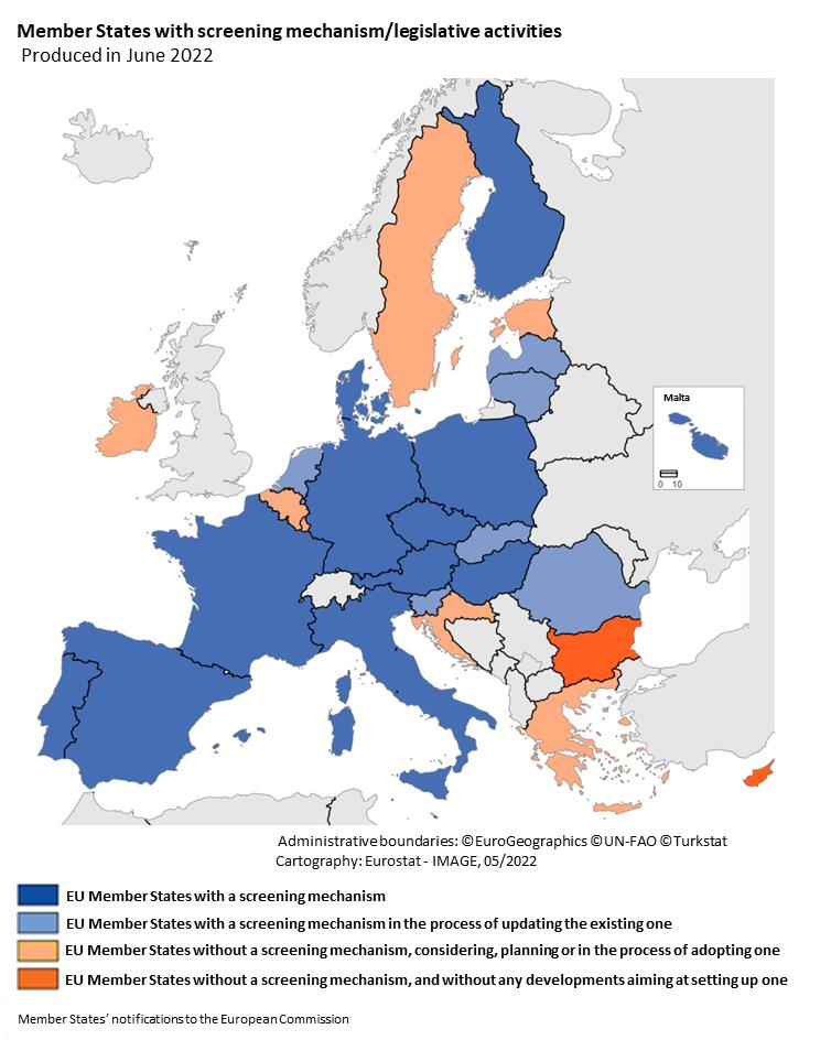 欧盟于2022年9月发布《2021外商直接投资审查年度报告》(“报告”)。截至报告出具之日,在欧盟27个成员国中,除保加利亚和塞浦路斯尚未公开宣布有相关机制外,其他25个成员国均已建立或已启动立法程序建立外国直接投资审查机制。