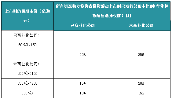 根据上市申请人是否属于已商业化公司及其上市时的预期市值,联交所就资深独立投资者的投资数额设定了不同的门槛。申请人股东中全体资深独立投资者的投资额合计(行使超额配售选择权前)占申请人上市时已发行总股本的比例应达到下表所列标准: