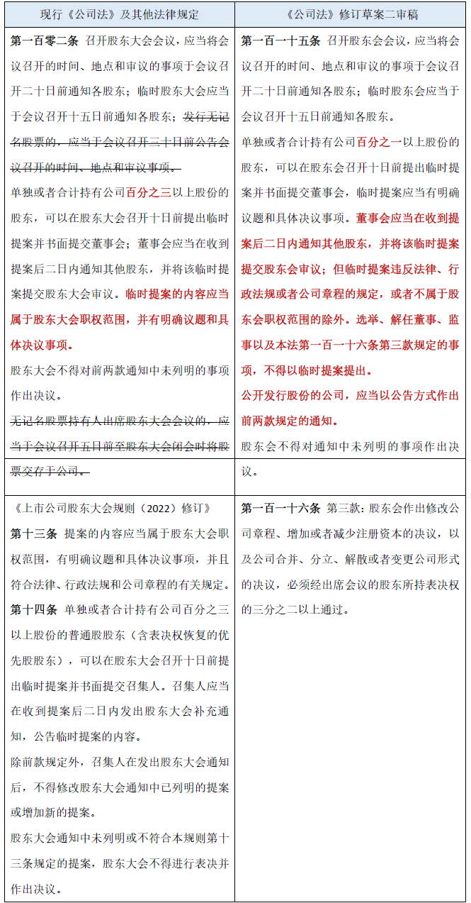 《公司法》修订草案二审稿将前述“重大事项突袭提案”的情形明确排除在临时提案的范围之外,将影响董事、监事席位以及公司资本和形式的恶性提案在法律的层面予以规制,是对公司自治的适当介入。此项变化也是对提案股东持股比例降低的关联调整,尽管股东形式临时提案权的门槛降低,但并不意味着对股东可以任性提案,而是从提案内容予以制约,实现了股东权利与公司经营稳定的利益平衡。
